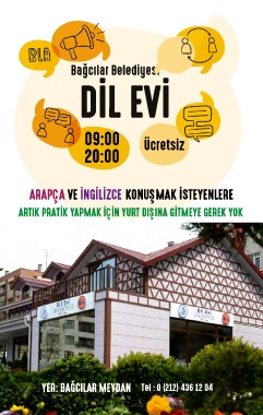 Bağcılar Belediyesi DİL EVİ 09:00 Ücretsiz 20:00 ARAPÇA VE İNGİLİZCE KONUŞMAK İSTEYENLERE ARTIK PRATİK YAPMAK İÇİN YURT DIŞINA GİTMEYE GEREK YOK YER: BAĞCILAR MEYDAN Tel : 0 (212) 436 12 04