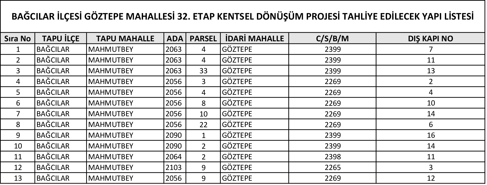 İstanbul ili, Bağcılar ilçesi, Göztepe Mahallesi sınırları içinde bulunan 32. ETAP uygulama alanında bulunan ve ekli listede adresleri gösterilen yapıların tahliye ve yıkımına ilişkin tebligat tutanakları ekli listede gösterilen yapılara ve Göztepe Mahalle Muhtarlığına (Göztepe Mahallesi, Saadet Sokak No:16) 23.01.2024 tarihinde on beş gün süre ile ilan edilmek üzere asılmıştır.