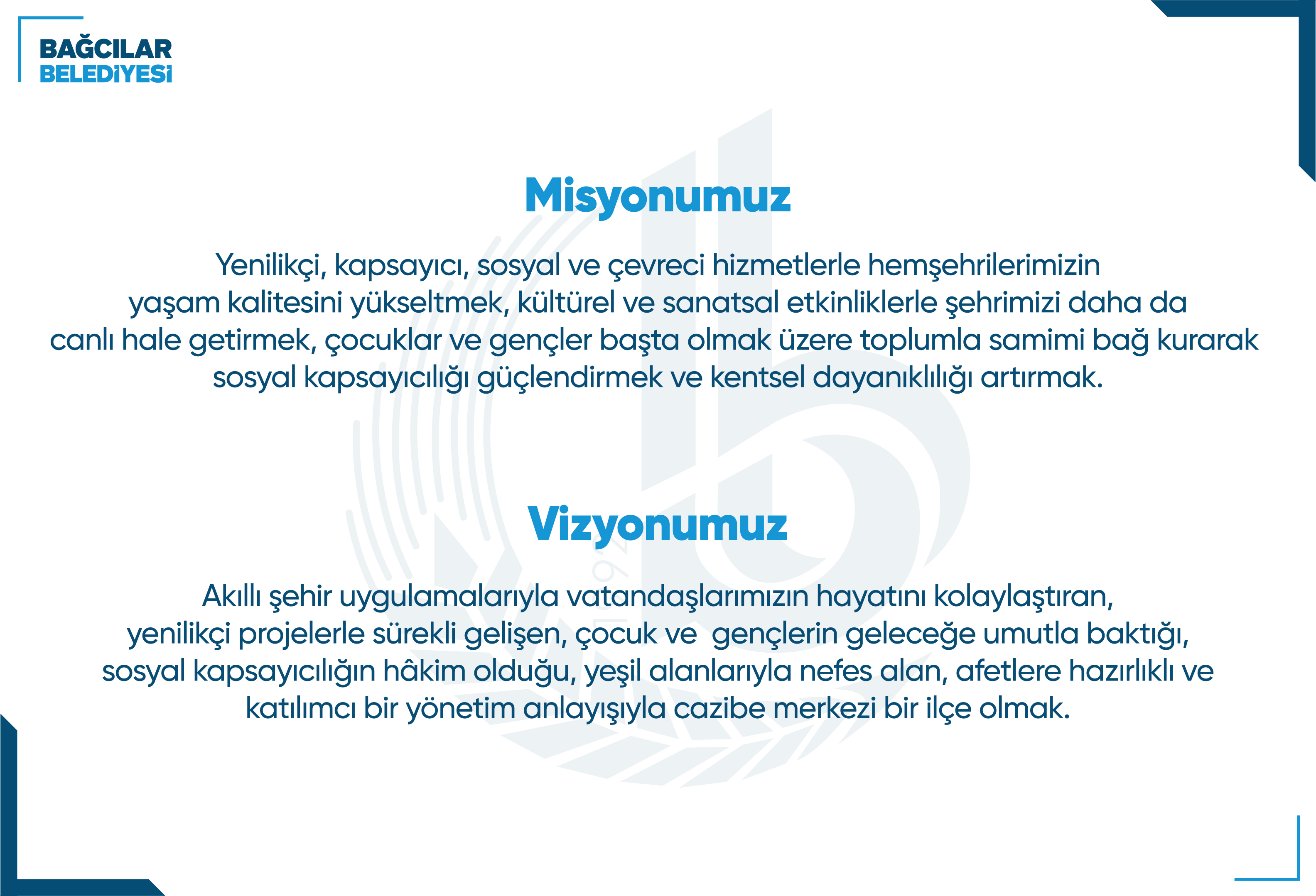 Yenilikçi, kapsayıcı, sosyal ve çevreci hizmetlerle hemşehrilerimizin yaşam kalitesini yükseltmek, kültürel ve sanatsal etkinliklerle şehrimizi daha da canlı hale getirmek, çocuklar ve gençler başta olmak üzere toplumla samimi bağ kurarak sosyal kapsayıcılığı güçlendirmek ve kentsel dayanıklılığı artırmak.