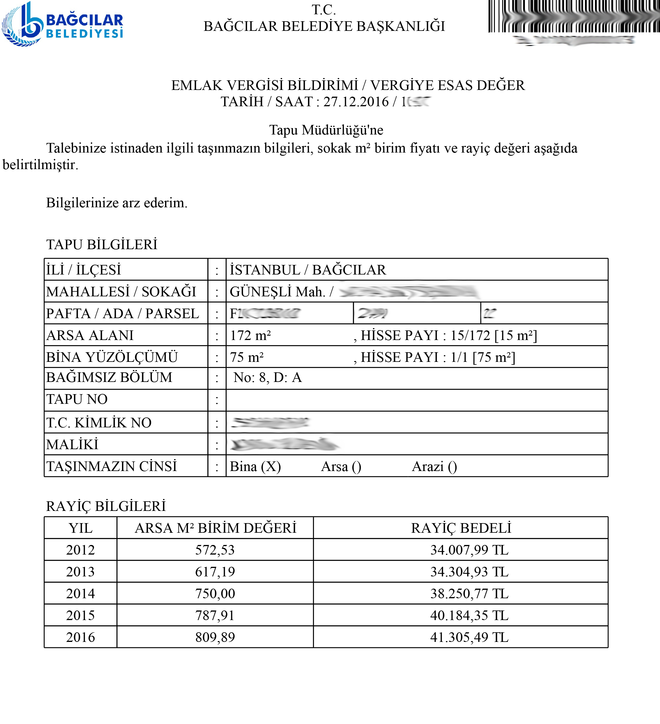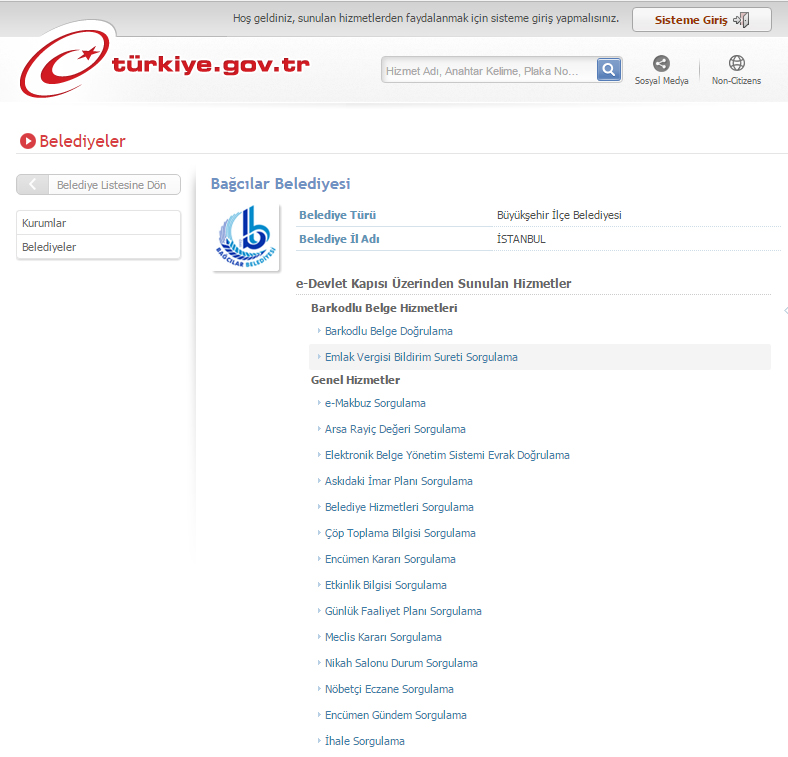 Belediyeler> Bağcılar Belediyesi > Emlak Vergisi Bildirim Sureti Sorgulama