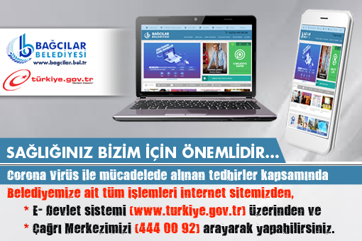 Korona (Covid-19) virüsü nedeni ile belediyemize gelmeden de, başvurularınızı ve işlemlerinizi (Ödeme İşlemleri, Borcu Yoktur Yazısı, Rayiç Değeri Bedel Yazısı, Vergi Bildirim İşlemleri) e-Belediye Kapısı (https://ebelediye.bagcilar.bel.tr/ebelediye), e-Devlet Kapısı (https://www.turkiye.gov.tr/bagcilar-belediyesi) ve Çağrı Merkezimiz (4440092) üzerinden yapabilirsiniz.