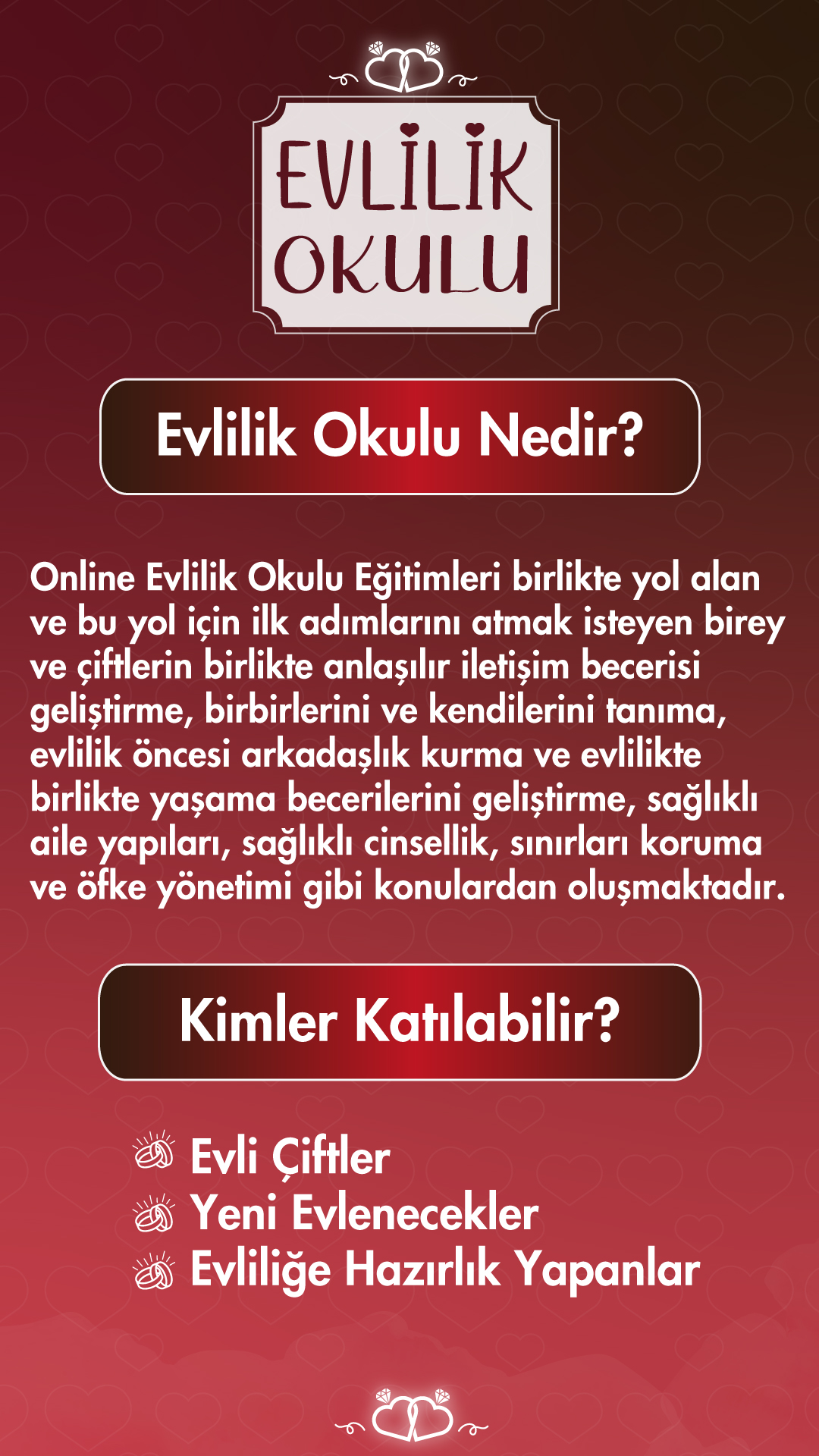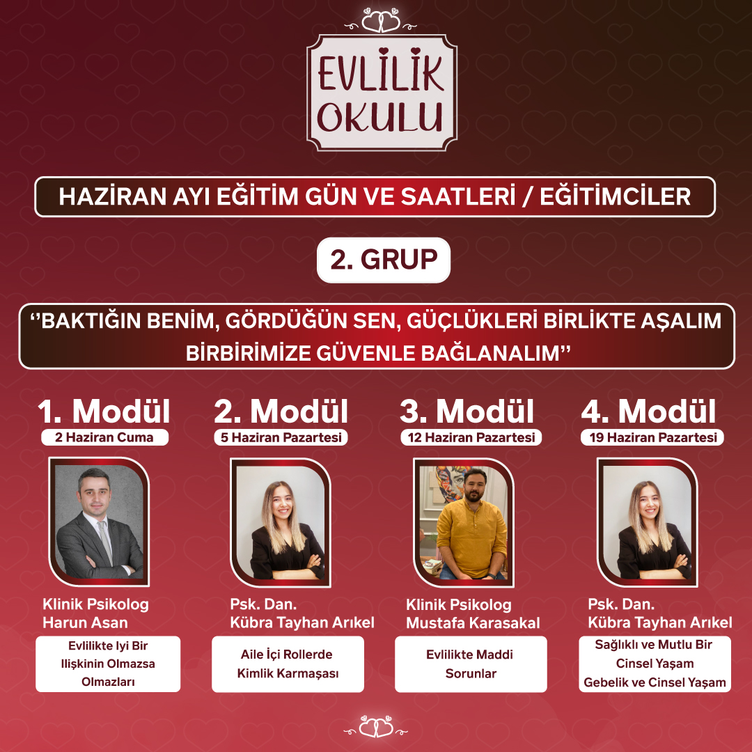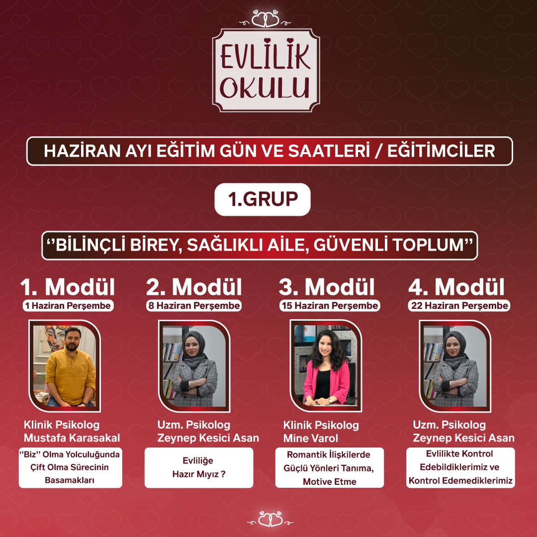 Online Evlilik Okulu Eğitimleri birlikte yol alan ve bu yol için ilk adımlarını atmak isteyen birey ve çiftlerin birlikte anlaşılır iletişim becerisi geliştirme birbirlerini ve kendilerini tanıma, evlilik öncesi arkadaşlık kurma ve evlilikte birlikte yaşama becerilerini geliştirme, sağlıklı aile yapıları, sağlıklı cinsellik, sınırları koruma ve öfke yönetimi gibi konulardan oluşmaktadır.