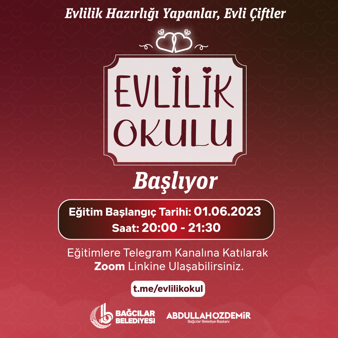 Bağcılar Belediyesi Aile Okulu Eğitimleri haftanın Cumartesi Günleri’nde yüz yüze olarak uzman eğitimcilerimizle yapılmaya devam etmektedir. Haziran ayı itibariyle, katılımcılarımızın zamanlama ve konu talepleri üzerine online olarak Evlilik Okulu olup iki grup eğitim modülleriyle devam edecektir.