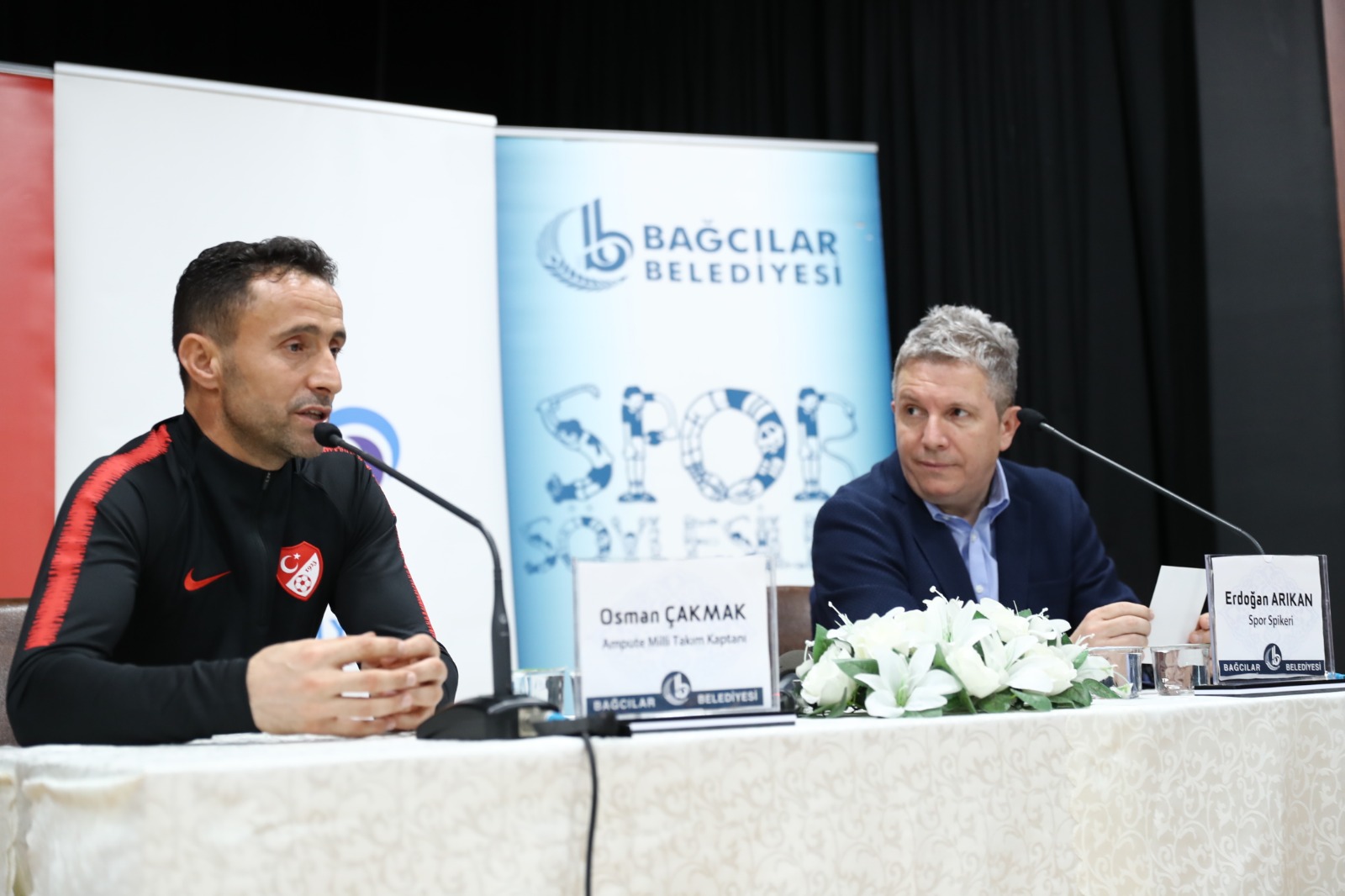 Önce Avrupa Şampiyonu ardından da dünya ikincisi olarak adını spor tarihine yazdıran Türkiye Ampute Futbol Milli Takım kaptanı Osman Çakmak, Bağcılar Belediyesi “Spor Söyleşileri” programına konuk oldu. Feyzullah Kıyıklık Engelliler Sarayı’nda gerçekleşen ve moderatörlüğünü TRT Spor spikeri Erdoğan Arıkan’ın yaptığı etkinlikte aralarında Altın Kızlar’ın da bulunduğu engelli sporcular Çakmak’ı dinlemeye geldi.