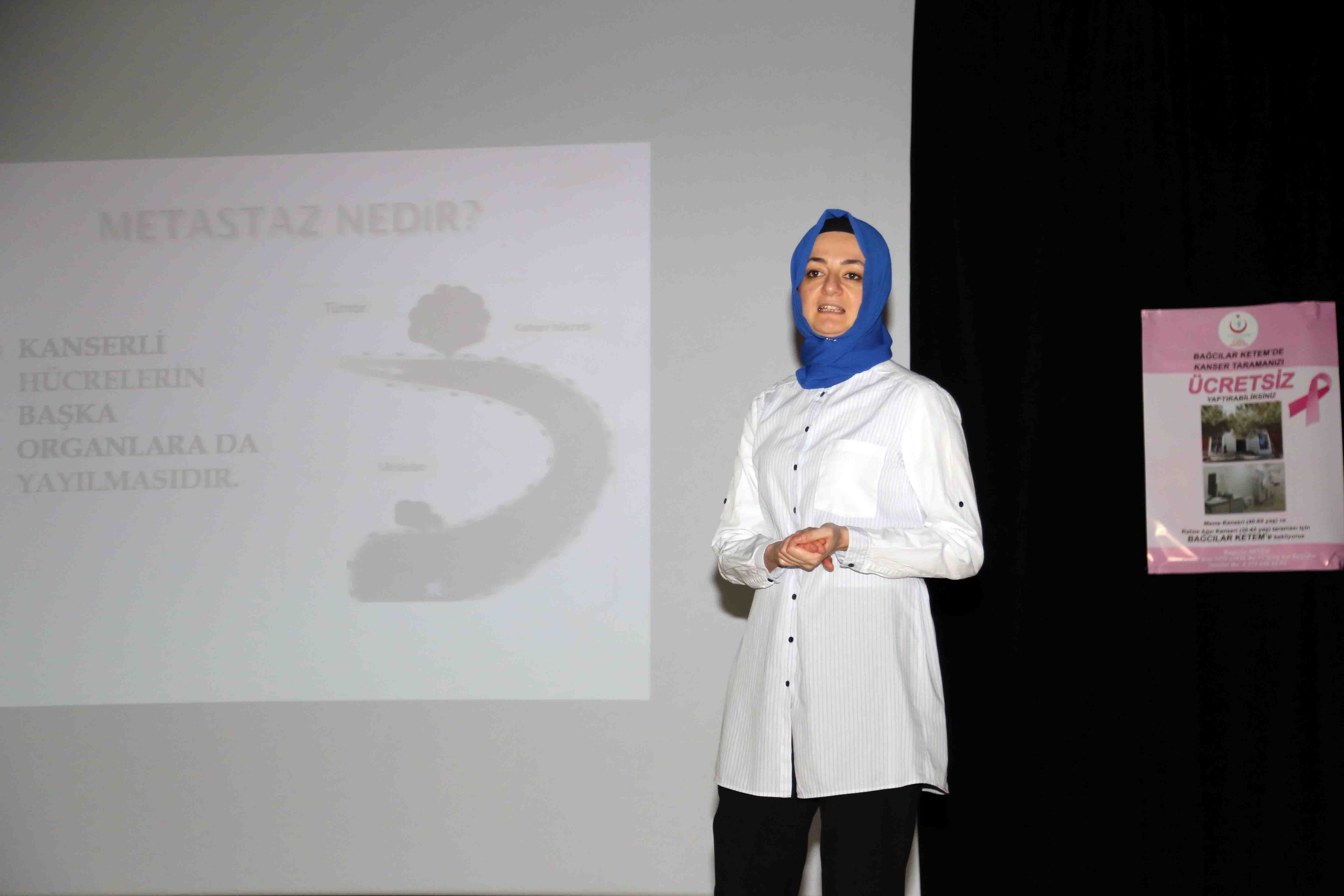 Bağcılar Belediyesi ile Bağcılar İlçe Sağlık Müdürlüğü tarafından ortaklaşa düzenlenen seminerde konuşan Halk Sağlığı uzmanı Dr. Sibel Karaaslan, erken tespit edilen meme kanserinde iyileşmenin yüzde 98 olduğunu belirterek, bütün kadınları ücretsiz kanser taraması yaptırmak üzere KETEM’e (Kanser Erken Teşhis, Tarama ve Eğitim Merkezi) davet etti.
