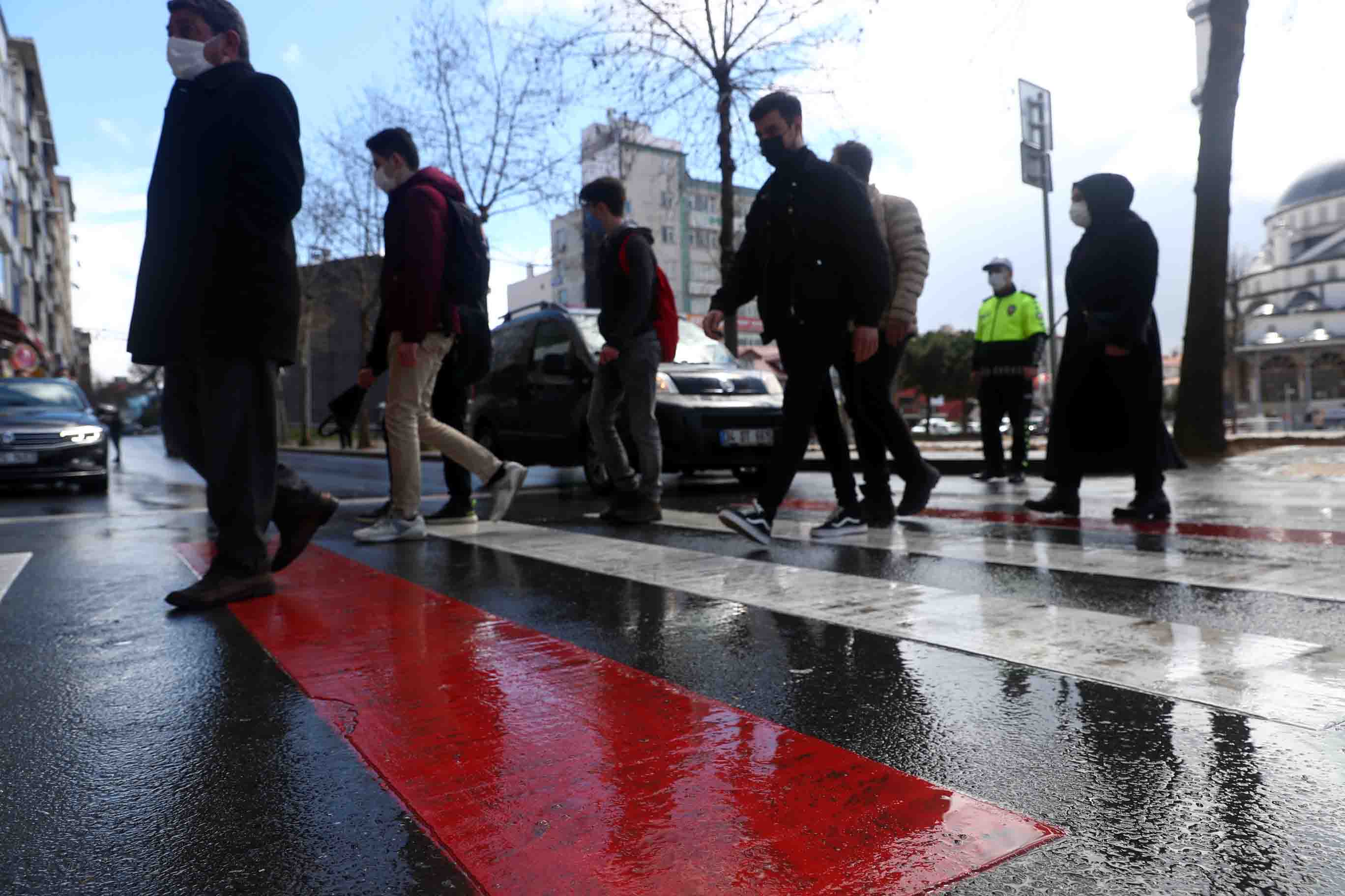 “Kırmızı çizgi, önce yaya” uygulaması kapsamında Bağcılar’da merkezi noktalardaki yaya geçitlerinin ortasına kırmızı şerit çizildi. Yayalara öncelik tanınmasına dikkat çekilen etkinlikte öğrenciler de ellerine fırça alıp Bağcılar Kaymakamı Mustafa Eldivan ve Bağcılar Belediye Başkanı Lokman Çağırıcı’yla birlikte şeritleri kırmızıya boyadı.