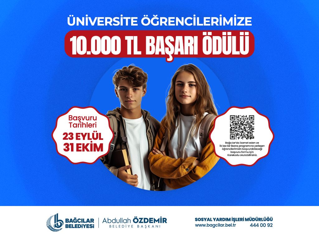 Bağcılar Belediyesi kültür, sanat ve spor alanında olduğu gibi eğitimde de gençlere desteğini sürdürüyor. Bu kapsamda 2024-2025 eğitim-öğretim döneminde devlet veya özel üniversitelerin lisans programlarında bu sene örgün eğitime yerleşenlere 10 bin TL başarı ödülü verecek. Bu destekten Bağcılar’da ikamet eden ve bu yıl devlet üniversiteleri ve özel üniversitelerin yüzde 100 burslu lisans programlarında örgün eğitime yerleşenler yararlanabilecek.